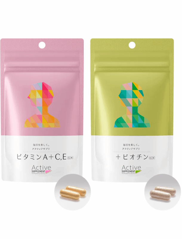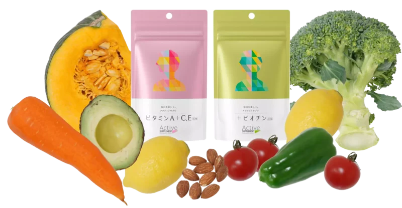 サプリメントによるインナーケアは、手軽に全身のケアができるところが魅力のひとつです。アクティブサプリのビタミンA+C,E & +ビオチンは、ビタミンA、還元物質、ビオチンなどの組み合わせで、髪の毛から爪の先まで、あなたの全身に透明感とツヤめきを届けます。