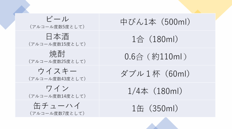 個人差はありますが『厚生労働省 飲酒のガイドライン』によると、節度ある適度な飲酒は1日平均純アルコールで20g程度とされています。