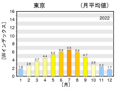 出典:気象庁ホームページ/日最大UVインデックス(解析値)の年間推移グラフ 2022年東京